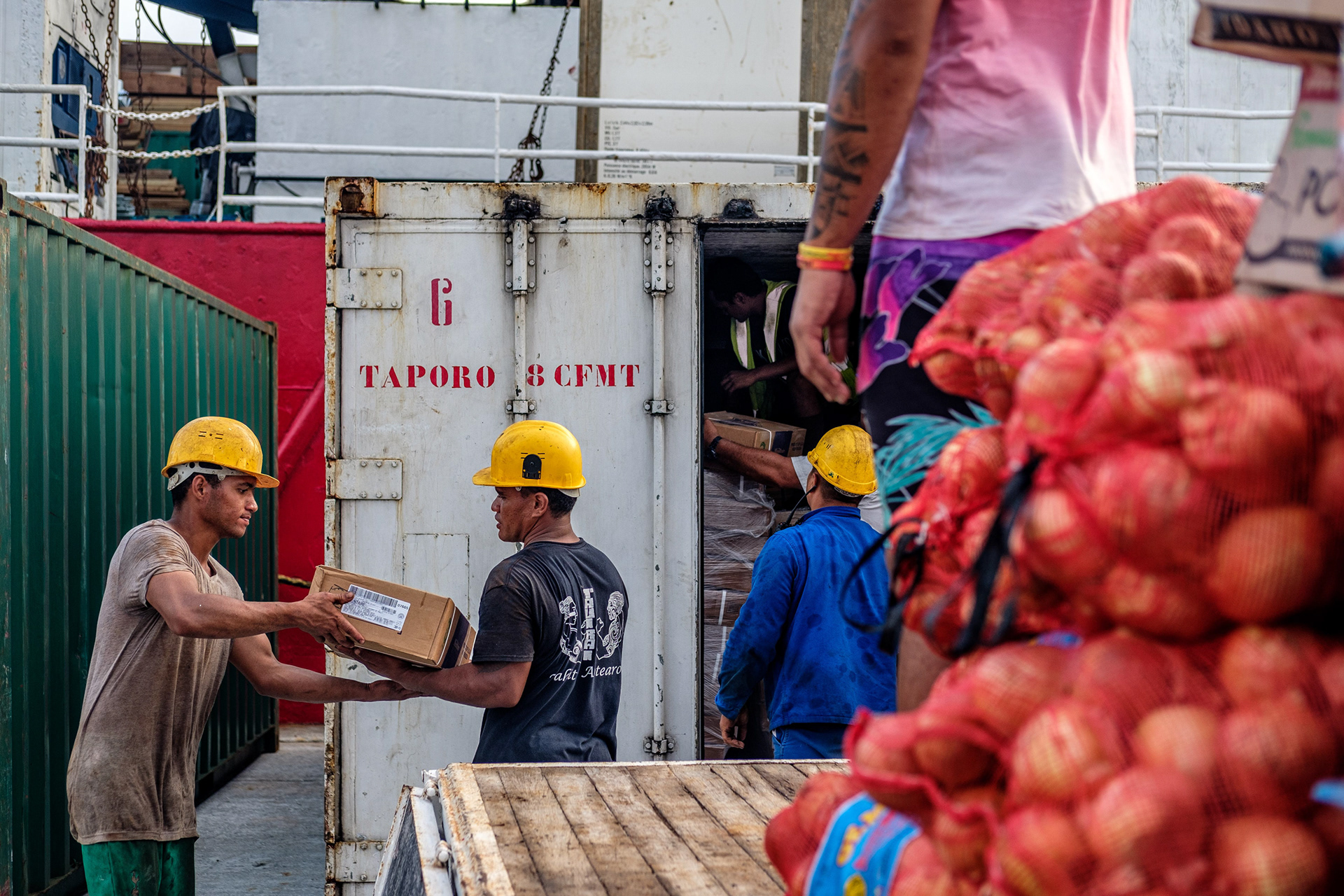 Arrival of the cargo ship Taporo VIII, maritime quay in the former military zone, Hao 2021